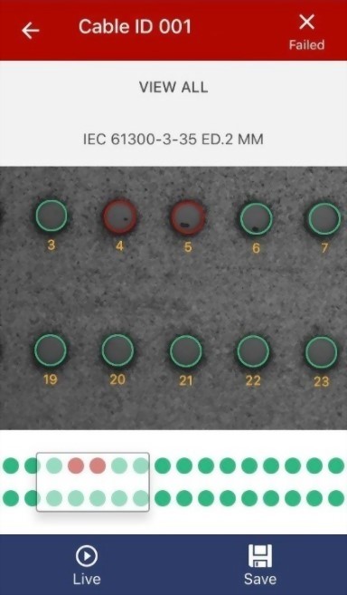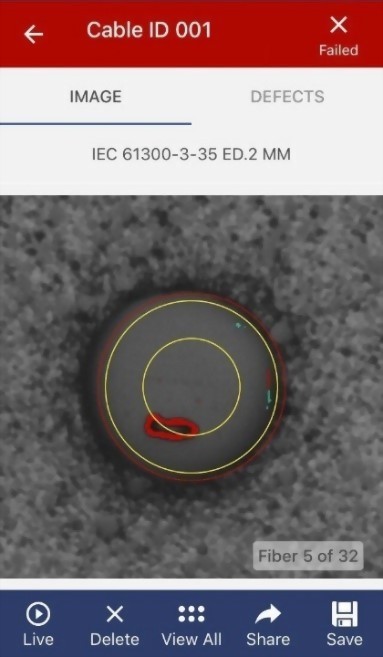 從摘要視圖(左)切換到圖像(中),然後可以使用手勢放大各個光纖的視圖(右)並平移查看整個連接器。各個光纖都有標籤,讓您知道您看到的是什麼。紅色缺陷是不符合選定標準的,綠色是可接受的。